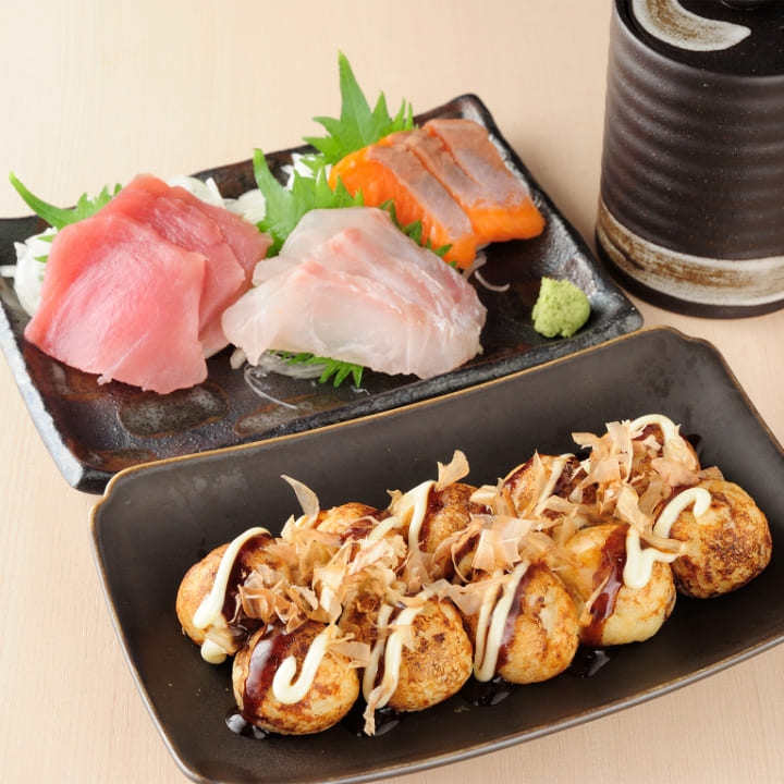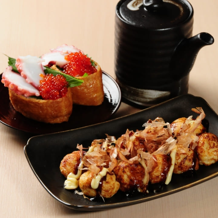 ・選べるたこ焼き(8種類)・おまかせ5串・チョレギサラダ・とん平焼き・タコカルパッチョ・海鮮稲荷・ゆずシャーベット
