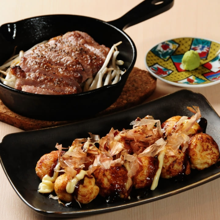 13種類のたこ焼きが120分(LO90分)食べ放題で楽しめる贅沢なコースが登場!大阪名物の串カツ5種も付いており、ボリューム満点!さらに、和牛ステーキも堪能できるので、たこ焼きをもっと楽しみたい方にぴったりのプランです♪1名様からご利用可能なので、お一人でも気軽にお越し頂けます。友人や家族と一緒に、特別なひと時をお楽しみ下さい!